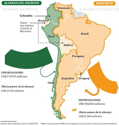 La Alianza del Pacífico supera al Mercosur en comercio. Exportó en 2012 por US$ 573.870 millones -sobre todo México hacia Estados Unidos-, frente a 438.840 millones de su rival.
