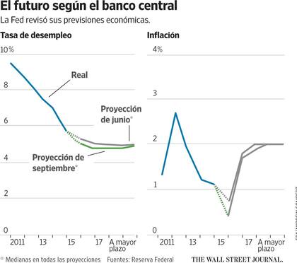 Aunque el organismo contempla una alza de tasas durante este año, su magnitud se ha moderado en los últimos meses. La proyección mediana, es decir la que se ubica en el medio, para las tasas a fin de 2015 cayó de 0,625% en junio a 0,375%. La cifra para el final de 2016 descendió de 1,625% en junio a 1,375%. A largo plazo, la Fed contempla que su tasa de referencia llegará a 3,5%, frente a una estimación previa de 3,75%.