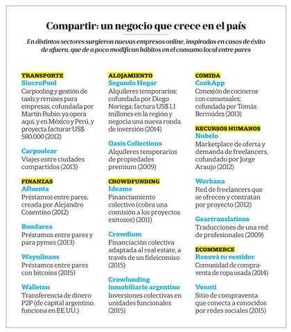 La innovación ha cambiado el consumo en distintos campos y ha inaugurado una nueva modalidad de "consumo colaborativo", ajustado a una demanda personalizada extendida alrededor del mundo. Grandes referentes, como Airbnb y Uber (esta última, de un valor estimado en US$ 62.500 millones), son casos testigo de la adopción global de este nuevo paradigma. Pero no son los únicos: los negocios de par a par (peer to peer) proliferaron en distintos sectores y países, incluso en la Argentina.