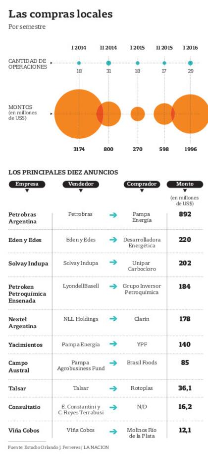 La argentina Pampa Energía se quedó con el 67% de Petrobras Argentina por unos US$ 892 millones. BRF, la mayor alimentaria del país vecino, adquirió Campo Austral en unos US$ 85 millones, y la mexicana Bimbo no dudó en firmar la compra de la filial local del negocio de panes congelados y medialunas que era de General Mills. El Grupo Clarín pagó US$ 178 millones por el 51% de Nextel Argentina y la colombiana Avianca despegó en nuestro país con la adquisición de la firma de vuelos ejecutivos de la familia Macri Macair. Son sólo cinco ejemplos de las 29 operaciones de compra y venta de empresas que se produjeron en el primer semestre de este año.