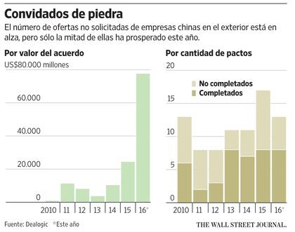 A menudo, esas empresas se zambullen de cabeza en batallas de adquisiciones globales, con ofertas que superan las de las empresas que ya han sellado un trato. En lo que va del año, 13 compañías chinas han realizado ofertas no solicitadas por empresas internacionales por un valor de US$78.000 millones. En 2015 se produjeron 17 propuestas de este tipo, todo un récord, según Dealogic.