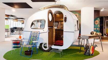 Diseñado por el estudio local de D/DOCK, la oficina de Amsterdam de Google también tiene diseños que se inspiran en la historia cultural del lugar, capturando el sabor visual y la alegría de la ciudad. Los paneles del techo están diseñados para parecerse a las stroopwafels, típicas galletas de caramelo del país. Las caravanas de los años sesenta sirven como salas de reuniones, equipadas con sillas de jardín y grills falsos.