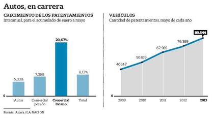 Para el acumulado de enero a mayo, las ventas de vehículos alcanzaron las 422.225 unidades, 8,13% más que en igual período de 2012. Los vehículos que mostraron el mayor dinamismo fueron los "comerciales livianos" (camionetas y pickups), cuyas ventas, para el acumulado de los primeros cinco meses, registraron un crecimiento interanual cercano al 21 por ciento. En el caso de los automóviles la suba fue de 5,3%, mientras que los patentamientos de los vehículos pesados aumentaron 7,4 por ciento.