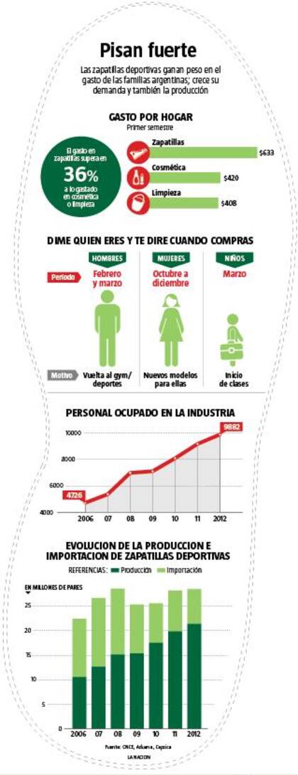 El gasto de los hogares argentinos en zapatillas ha crecido en los últimos años, hasta llegar en la actualidad a superar el monto que se invierte en cosmética y limpieza. "Por cada $ 100 destinados a zapatillas, se gastan 94 en limpieza y 90 en cosmética", precisa Jorge Guauque, analista de Kantar Worldpanel.