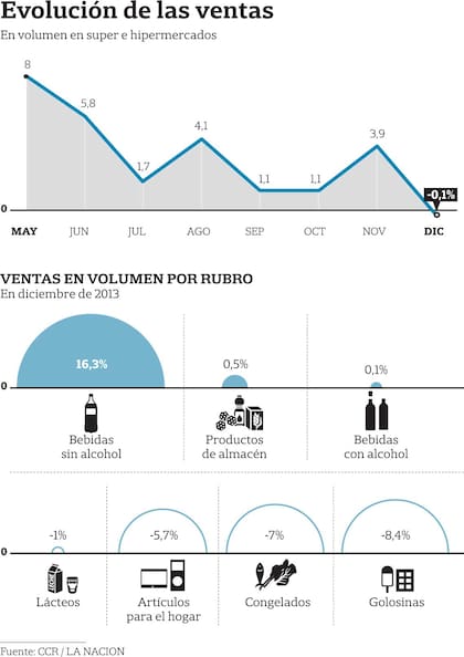 La caída de diciembre fue generalizada en prácticamente todos los grandes rubros, y podría haber sido muy superior si el clima no hubiera ayudado para que se dispararan las ventas de las bebidas sin alcohol. Esta categoría cerró el último mes del año con una fuerte suba del 16,3% en volumen, que contrastó con el pobre desempeño del resto. Las mayores caídas se registraron en rubros que no son de primera necesidad, como golosinas (-8,4%) o alimentos congelados (7%), lo que también da cuenta de un proceso de empobrecimiento del consumo.