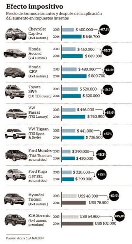 La suba de precios responde, principalmente, al aumento en los impuestos internos, cuya alícuota se fijó en 30% para los autos con un precio de fábrica de entre $ 170.000 y 210.000, y en 50% para los modelos con un precio mayor a $ 210.000. De allí que el impacto no se limita a las camionetas, sino que también alcanza a algunos automóviles de marcas que no están entre las más costosas del mercado. El Passat de Volkswagen, en su versión TSi Luxury (que no es la más cara), costaba el año pasado $ 456.000 y ahora cuesta $ 760.900, lo que implica una suba de 67 por ciento. El Honda Accord en su versión automática 2.4 subió 53,2%, de 450.000 a 689.300 pesos, y, en un rango de precios más bajos, el Ford Mondeo Titanium con caja automática pasó de 290.000 a 430.000 pesos.