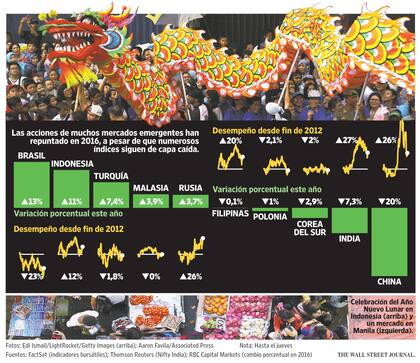 Los mercados emergentes, que el año pasado se derrumbaron, han repuntado en las últimas semanas en medio de la recuperación de los precios de las materias primas y la confianza de que la Reserva Federal de Estados Unidos no subirá pronto las tasas de interés.