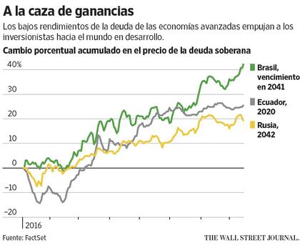 De todos modos, incluso los bonos de gobiernos que han tenido cesaciones de pagos en el pasado están atrayendo fondos globales. Ecuador pagó US$650 millones en bonos el año pasado, la primera vez en más de 180 años que saldó su deuda exterior a tiempo. El país emitió nueva deuda en enero que madura en 2020 y rinde más de 22%. Sin embargo, la entrada de capital extranjero a Ecuador ayudó a bajar ese rendimiento a 10,4%. Los rendimientos y los precios de los bonos se mueven en direcciones opuestas.