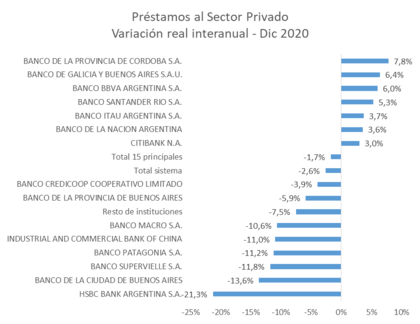 Los tres bancos privados más grandes del sistema, más uno público regional, otro privado mediano, el mayor banco público y uno que sólo opera a nivel mayorista fueron los más activos en la asistencia crediticia a sus clientes, según se desprende de la tasa de crecimiento real que mostró su cartera de préstamos al sector privado durante 2020.