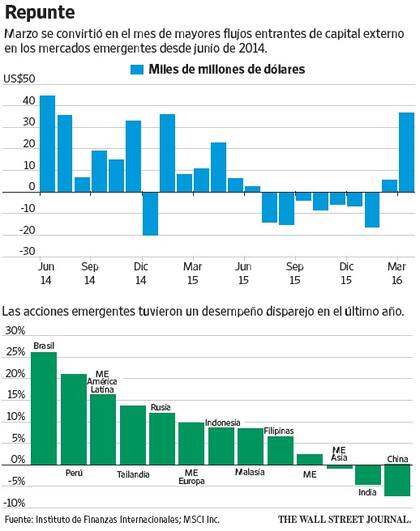 En marzo, los flujos entrantes hacia los fondos de acciones y bonos de mercados emergentes alcanzaron un máximo de 21 meses, de US$36.800 millones, según el IIF.