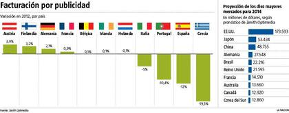 El cuadro de los mercados con mayor desarrollo entre 2011 y 2014 muestra el creciente protagonismo de los emergentes, en especial de los que integran el BRIC, que ZenithOptimedia desglosa así: primero China, con US$ 16.456 millones; escoltada por Brasil, con 5397 millones; Rusia, con 4305 millones, y la India, con 1540 millones de dólares. La Argentina figura en esta lista con una facturación publicitaria de US$ 2268 millones.