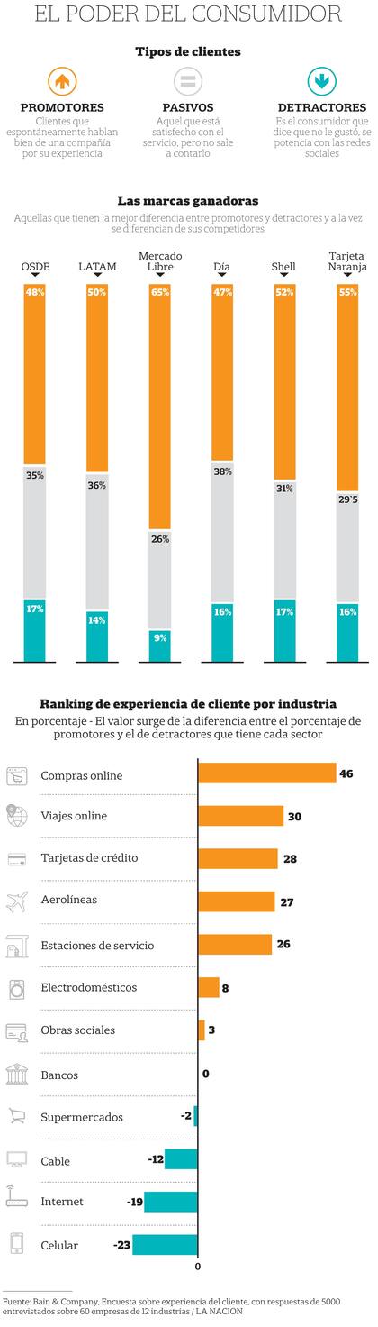 El primer estudio de Experiencia de Cliente a nivel nacional realizado por Bain en la Argentina (a partir de una encuesta a 5000 personas), y que LA NACION publica de manera exclusiva, da 11 ganadores en 12 industrias definidas por la firma: Mercado Libre (e-commerce); Tarjeta Naranja (tarjetas de crédito); Latam (aerolíneas); Shell (estaciones de servicio); Garbarino (electrodomésticos); Osde (obras sociales); DIA (supermercados); DirecTV (cable ); Telecentro y Fibertel (comparten el primer lugar en Internet) y Claro (celulares). En las categorías "bancos" y "viajes online" no hubo un claro vencedor. Dentro de los triunfadores, cinco marcas se destacan por sus altos puntajes y por la ventaja por sobre sus competidores dentro de su sector: Mercado Libre, Latam, Osde, DIA y Shell.