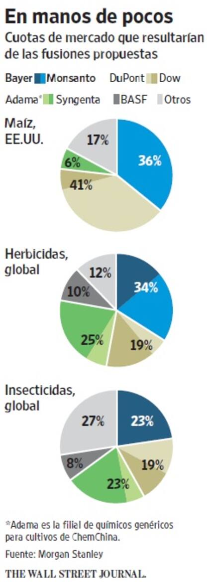 La adquisición de Monsanto es la más reciente página de una ola de acuerdos que ha reorganizado el mercado global de semillas agrícolas y pesticidas en apenas 10 meses, mientras las empresas de fertilizantes también han buscado sus propios acuerdos. Los fabricantes de semillas, tras haber despedido a miles de empleados y paralizado proyectos de investigación, ven las fusiones como una forma de reducir los costos e integrar más profundamente el desarrollo de nuevas y semillas y químicos.