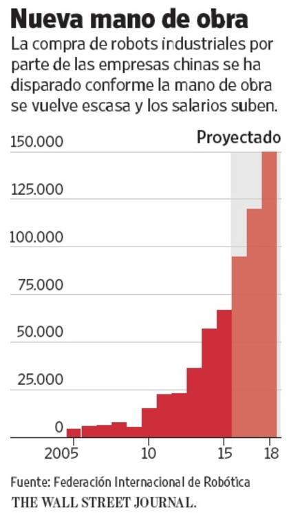 En 2013, China se convirtió en el mayor mercado para robots industriales, sobrepasando a toda Europa Occidental, según la Federación Internacional de Robótica. En 2015, las fábricas chinas compraron cerca de 67.000 robots, casi un cuarto de las ventas globales, y se proyecta que la demanda se más que duplique para 2018, a 150.000 unidades al año.