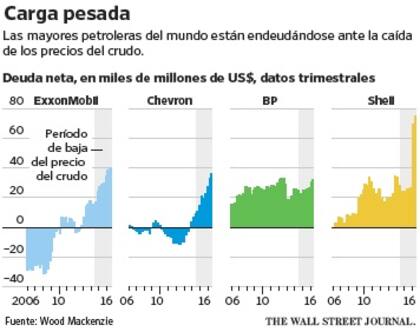 Exxon Mobil Corp., Royal Dutch Shell PLC, BP PLC y Chevron Corp. acumulan una deuda neta combinada de US$184.000 millones, más del doble que en 2014, cuando los precios del petróleo comenzaron una brusca caída que tocó fondo a principios de este año, cuando el barril se cotizaba a US$27. Los precios del crudo han rebotado desde entonces, pero todavía rondan US$50 el barril.