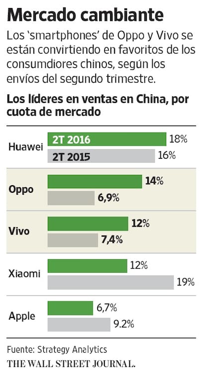 Durante el último año, Oppo ha duplicado su cuota de mercado en China, a 14%, según Strategy Analytics. En el mismo lapso, Vivo se ha apoderado de 12% del mercado, frente al 7,4% que tenía antes, según despachos a los puntos de venta. Huawei sigue siendo el número uno, con 18% del mercado, pero Apple y Xiaomi han registrado un descenso en sus cuotas de mercado.