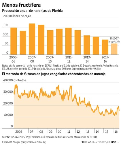 Elizabeth Steger, una analista independiente muy seguida por los productores, estimó que en el año que comienza el 1 de octubre Florida producirá 60,5 millones de cajas de naranjas. Eso sería 26% menos que los 81,5 millones de cajas estimadas por el Departamento de Agricultura de EE.UU. (USDA. por sus siglas en inglés) para 2015-16.