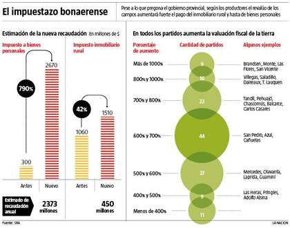 Por si fuera poco, por la reforma impositiva ganará más el gobierno nacional que el provincial. Al revaluarse las tierras, la presidenta Cristina Kirchner subirá 790% la recaudación por bienes personales, que no se coparticipa. Pasará de 300 a $ 2670 millones. "Es la primera vez que los legisladores votan por un impuesto nacional", dijo Rodes. En tanto, Scioli verá crecer la recaudación por el inmobiliario rural un 42%, al trepar de 1060 a 1510 millones de pesos. "La medida extrae del sector más de 2820 millones de pesos adicionales", destacó Fielder. A todo esto, luego de una asamblea realizada anteayer en Ramallo, el campo hará otra mañana en Carlos Casares y prepara otra para el 29 en Ayacucho.