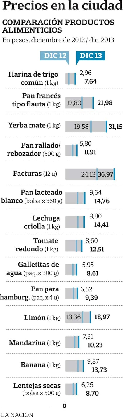 Pero no sólo los derivados de la harina tuvieron fuertes subas en 2013. También aumentaron el kilo de yerba mate (59%), el kilo de lechuga criolla (47%), la docena de empanadas cocidas para llevar (41,2%), el kilo de mandarina (40%), el kilo de banana (39%), la bolsa de 500 gramos de lentejas (39%), el litro de leche entera (37,5%) o la manteca (35%), entre otros productos.