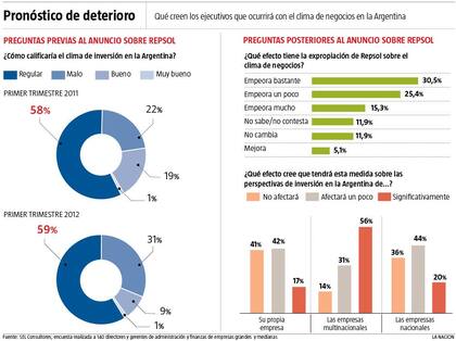 Siete de cada diez ejecutivos de empresas consideran que la decisión tomada por el Gobierno de estatizar el 51% de la propiedad de YPF empeora el clima de negocios en la Argentina. Al analizar la posibilidad de una consecuencia más palpable aún, el 59% respondió que la medida tiene impacto sobre las perspectivas de inversión de la propia compañía en la que trabajan: un 42% considera que "afectará un poco" y otro 17% cree que ese efecto será "significativo" en sus negocios.