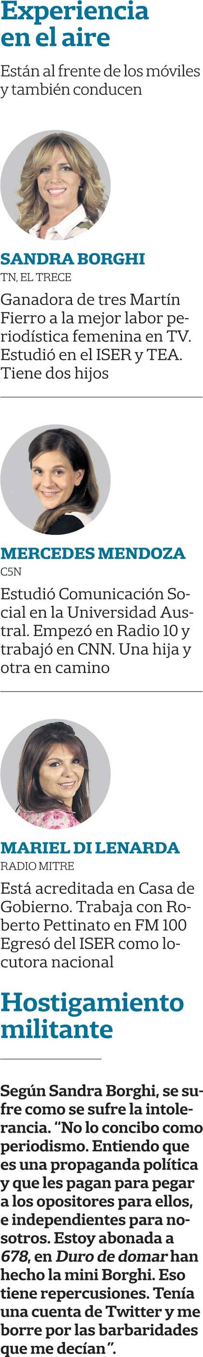 Sandra Borghi: –El trabajo en la calle tiene muchas dificultades, pero también es apasionante. Nos pasan muchas cosas: coberturas complicadas, tomas de rehenes, un enfrentamiento en una villa... Ahí nadie dice no va Sandra porque es mujer. Va el periodista que está a cargo del móvil y si sos mujer, no pasa nada. El enfrentamiento hay que cubrirlo de cualquier modo, sea cual fuere la condición, y estar ahí te pone en la trinchera. Y vos querés estar en la trinchera.