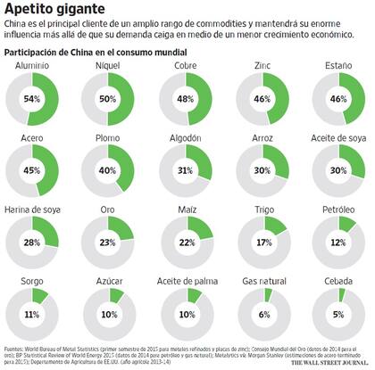 La Administración de Información de Energía de EE.UU. cree que, a pesar del menor crecimiento del consumo de crudo por parte de China, el país aún representará más de un cuarto del aumento de la demanda global de petróleo este año. China consume hoy 46% del cobre del mundo, después de registrar 7,5% de crecimiento compuesto de la demanda cada año desde 2010 hasta 2014. Deutsche Bank AG estima ahora que este ritmo caerá a 3% al año hasta 2020. El incremento en su consumo anual de aluminio se desacelerará de entre 8% y 10% registrado en los últimos años a entre 5% y 6% en los próximos 10 a 15 años, señaló el banco.
