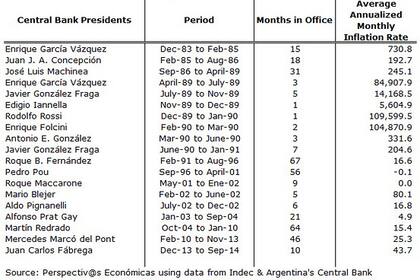 La mayoría de los muchos presidentes del Banco Central de Argentina parecen haber sido incapaces de frenar la inflación. De hecho, con algunas pocas excepciones, los gobiernos y presidentes del Banco Central han tratado el problema de manera inefectiva o incluso permisivamente, como si fuera una molestia inofensiva.