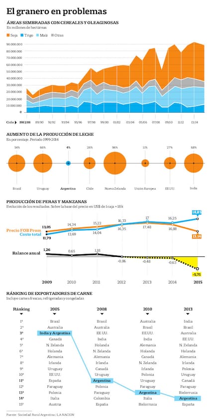 Todos los productos del campo retrocedieron, excepto "el yuyo", como la Presidenta llama a su exitosa soja. Del total del área sembrada en el país, esta oleaginosa representa el 62%, número que el Gobierno impulsó sobre todo cuando el precio tocó su pico en 2008 (US$ 651, la tonelada). Las retenciones al 35% fueron entonces el gran motor de la recaudación. China es el gran importador: mueve el 73% del comercio mundial (un 245% más que hace 12 años). Hoy la soja está a US$ 360 la tonelada. Un informe de la SRA de 2014 afirma que de una producción de 31,5 millones de toneladas en 2003/2004, se llegó el año pasado a 54 millones y para 2015 se esperan 60 millones.