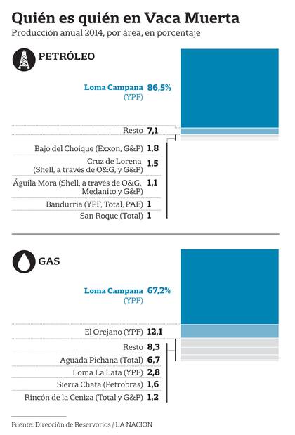 La operación de Loma Campana es uno de los mayores proyectos de inversión en el país en los últimos años. Aunque despertó polémica, les permitió a las arcas del Banco Central recibir sólo el primer año del proyecto unos 1240 millones de dólares que puso la socia de YPF. De Loma Campana se extrae el 86,5% del petróleo de Vaca Muerta. El resto de las áreas, en cambio, tienen una participación inferior al 2% cada una, según el informe anual de producción no convencional de petróleo y gas de la provincia de Neuquén. Se distribuye entre empresas como Shell, Gas & Petróleo del Neuquén (provincial), Total, Pan American Energy (PAE), Exxon y Medanito.