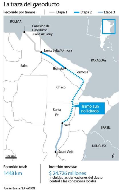La licitación en curso, según describe Enarsa en su página web, comprende tres tramos: el primero arranca en el norte de Salta, en la conexión con el gasoducto Juana Azurduy, hasta el límite con Formosa; el segundo llega hasta la localidad de Ibarreta, en el centro formoseño, y el tercero parte de la zona de Vera, en el norte de Santa Fe, hasta su conclusión en Sauce Viejo, cerca de la capital provincial. De acuerdo con fuentes al tanto del proyecto, el presupuesto supera los US$ 800 millones y los resultados están "en estudio". Aún no se llamó a concurso por el tramo entre Formosa y Santa Fe.