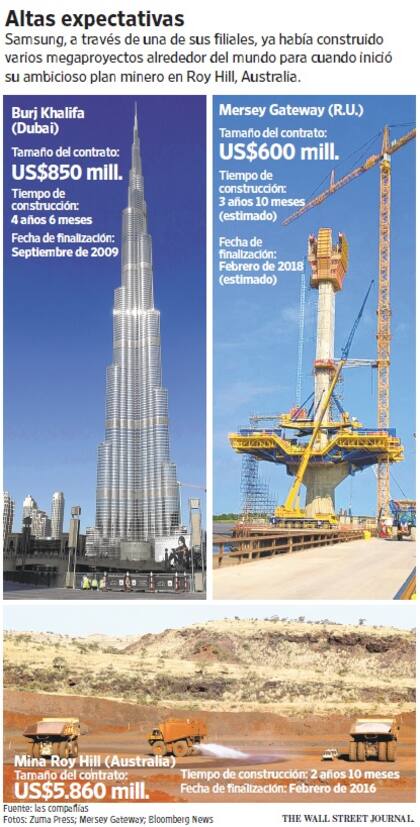 A través de Samsung C&T Corp., su filial de construcción, el conglomerado surcoreano ya había emprendido grandes proyectos de ingeniería, como el rascacielos Burj Khalifa en Dubai. Dado el auge mundial de las materias primas, la compañía consideró que la mina Roy Hill, propiedad de la magnate Gina Rinehart, sería otro éxito.