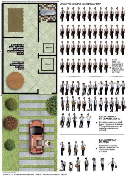 "Los datos son reveladores –comenta Cruces–. En el período que va desde 1976 hasta 2001 un joven profesional compraba entre 1,27 y 1,38 metros cuadrados con un sueldo. Ahora, un trabajador con las mismas condiciones y calificaciones compra 0,81 metros cuadrados. Es decir, antes necesitaba 45 meses para comprar un departamento de 60 metros y ahora 74 meses."