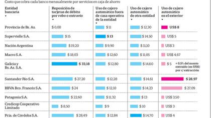 Allí, entre otras cosas, se observa que los bancos con más cajas de ahorro activas, cobran de $ 9 (Credicoop) a $ 13 (Supervielle) a los clientes que usan sus tarjetas de débito en cajeros de otros bancos y entre $ 10 (Credicoop) y $ 14,70 (Banco de Córdoba) si lo hacen mediante ATM pertenecientes además a otra red (ver gráfico).