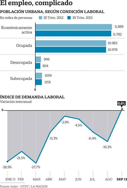 "La desocupación, merced a la actividad económica, ha vuelto a descender y se ubica en 6,8 por ciento", dijo la Presidenta en un discurso posterior a la jura de los nuevos ministros. En efecto, según el Instituto Nacional de Estadística y Censos (Indec), la tasa de desocupación urbana en el tercer trimestre del año fue de 6,8%, 0,8 puntos menos que en el mismo período de 2012. Sin embargo, esa baja no se debió a una mayor creación de empleo, sino a que muchas personas se cansaron de buscar trabajo y decidieron abandonar el mercado laboral.