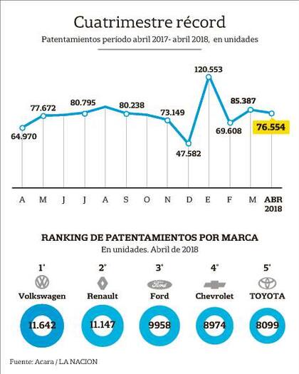La Asociación de Concesionarios de Automotores de la República Argentina (Acara) informó ayer que el número de vehículos patentados en abril subió a 76.554 unidades, un crecimiento del 17,8% con relación al mismo mes de 2017. El acumulado de los cuatro primeros meses asciende a 352.109 unidades, un alza del 18,4% con relación al primer cuatrimestre de 2017.
