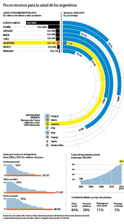 Los datos de la Organización Mundial de la Salud (que advierte sobre la inconveniencia de un sistema de financiamiento muy fragmentado) asignan a la Argentina un gasto per cápita de US$ 742 para 2010. El monto es un 7,7% superior al del año 2000, según cifras a valores constantes publicados por el Banco Mundial.