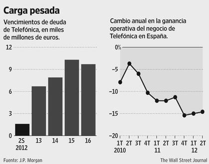 Telefónica, una de las mayores empresas de España en términos de capitalización bursátil y otrora un símbolo de orgullo de la expansión económica del país, se halla inmersa en la crisis española. La recesión que atraviesa la economía de España dificulta y encarece el financiamiento de su deuda de 58.000 millones de euros (US$75.000 millones). La compañía pagó en septiembre tasas de interés cinco veces más altas que France Télécom para vender sus bonos.
