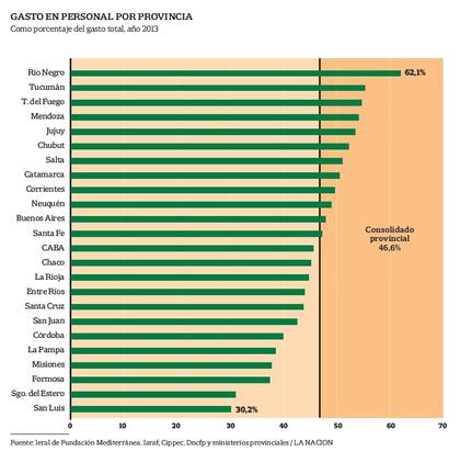 El gasto en personal representa el 46,6% del total. La provincia y la ciudad de Buenos Aires rondan ese promedio, mientras que los mayores niveles se observan en Río Negro, Tucumán y Tierra del Fuego, y los más bajos en San Luis, Santiago del Estero y Formosa. Los ejemplos de estas dos últimas provincias dejan en claro que no necesariamente un menor gasto en personal es sinónimo de eficiencia y desarrollo económico.