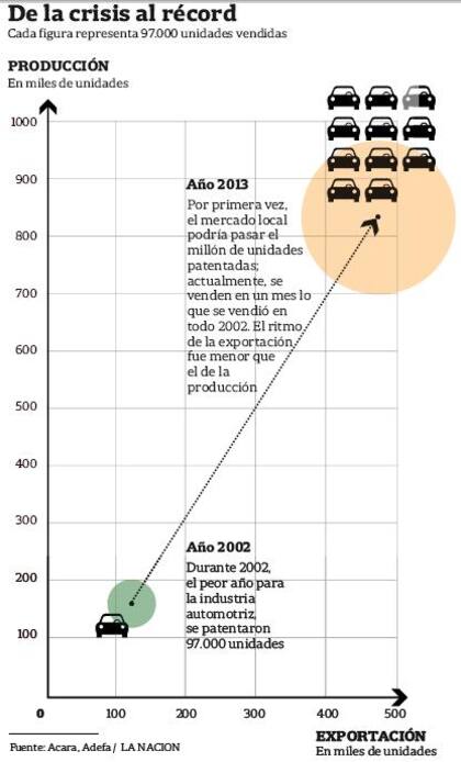 Según datos de Abeceb, una consultora que sigue muy de cerca los números del sector, en 2002 Brasil era el destino de 38 de cada 100 autos que se fabricaban en el país, 27 se vendían en el mercado interno y 35 iban a otros países. En 2012 la ecuación cambió y el 44% de los autos que salen de las terminales locales terminan en Brasil. El mercado interno ya absorbe 46% de los autos y el resto del mundo apenas compra 10% de la producción local.