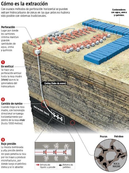 ¿De qué se trata esta tecnología? Desde hace un puñado de años se empezó a experimentar con perforaciones horizontales que permiten llegar a formaciones rocosas antes inaccesibles. Los pozos tradicionales siempre tuvieron perforaciones verticales que buscaban reservorios en la llamada "roca almacén". De allí, como si fuese una bombilla, se llevaba a la superficie el hidrocarburo en forma vertical.