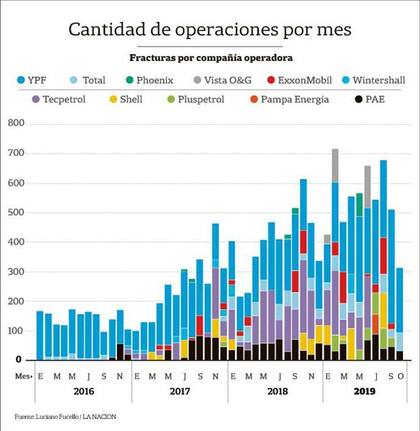 En el gráfico de fracturas puede verse que hasta mediados de 2017 el único jugador en Vaca Muerta era YPF. En los últimos años se logró que ingresaran otros actores a desarrollar la formación. Entre los nuevos jugadores que anunciaron inversiones estuvieron Shell, ExxonMobil, Tecpetrol -la petrolera del Grupo Techint- y Vista Oil & Gas -la empresa fundada por Miguel Galuccio-.