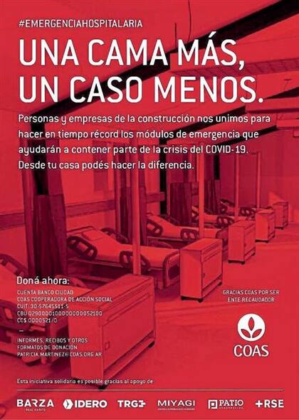 Muchas instituciones se han cargado al hombro el esfuerzo de dar respuesta a infinidad de necesidades. Entre ellas, se destaca la Cooperadora de Acción Social (COAS), que lleva ya 44 años trabajando sin pausa en favor de los hospitales públicos de nuestro país, instituciones claves hoy en la lucha que enfrentamos. Con su campaña Todos por los Hospitales, nos exhorta a sumar donaciones para la compra de equipos rodantes de rayos X, monitores multiparamétricos, respiradores, camas y camillas de traslado, solo algunos de los elementos que se demandan con mayor urgencia para el tratamiento de pacientes con coronavirus.