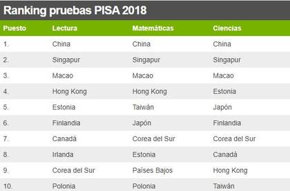 El país no asiático mejor posicionado fue la pequeña Estonia, cuarta global en lectura y ciencias y octava en matemáticas, en lo que también fue superada por Hong Kong, Taiwán, Japón y Corea del Sur.