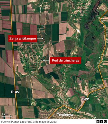 “Aquí serán grandes y estarán mejor escondidas, para así ralentizar los ataques ucranianos y para que otros elementos de combate, como la artillería y la infantería, puedan golpear a las fuerzas atacantes”, agregó. BBC Verify también descubrió que otras tres ciudades cercanas a Tokmak han sido fortificadas de forma similar.