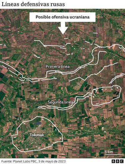 La imagen de satélite de arriba muestra que se excavó una red de trincheras en dos líneas al norte de Tokmak, la dirección desde la que Ucrania tendría que atacar.