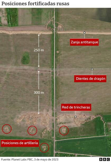 El equipo de BBC Verify develó algunas de las extensas defensas construidas por las tropas rusas; es probable que el esperado asalto sea una prueba crucial para Ucrania en su intento de demostrar que puede lograr avances significativos en el campo de batalla