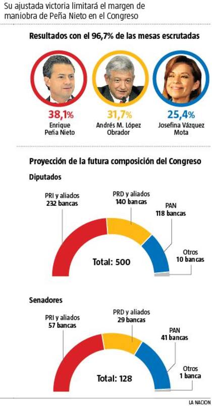 Por un lado, al no obtener mayoría absoluta en el Congreso, tendrán que pactar para aprobar las principales leyes. Pero la carga de profundidad llegó de la mano del izquierdista Andrés Manuel López Obrador, que no reconoció su derrota y anunció que impugnará las elecciones si las autoridades electorales confirman la victoria del PRI.