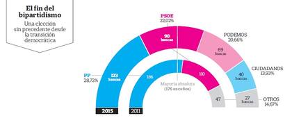 Aunque fue la fuerza más votada, el PP quedó muy lejos de la mayoría absoluta; la gran sorpresa fue Podemos; el fin del bipartidismo abre una nueva era política