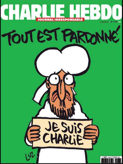 La tapa del ejemplar de Charlie Hebdo que saldrá a la venta mañana, adelantada por Libération, muestra una caricatura de Mahoma llorando con un cartel que dice "Je suis Charlie" y con el título "Está todo perdonado". La distribuidora del semanario anunció que se publicarán tres millones de ejemplares, y estará disponible en 16 idiomas