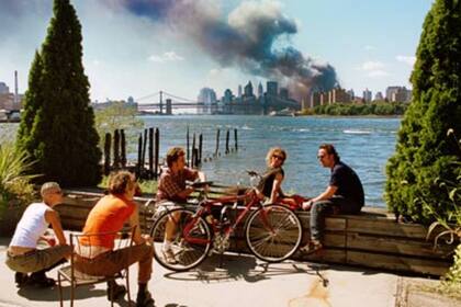 La fotografía muestra a un grupo de neoyorquinos charlando en un parque en Brooklyn mientras una nube de humo y polvo sobrevuela Manhattan